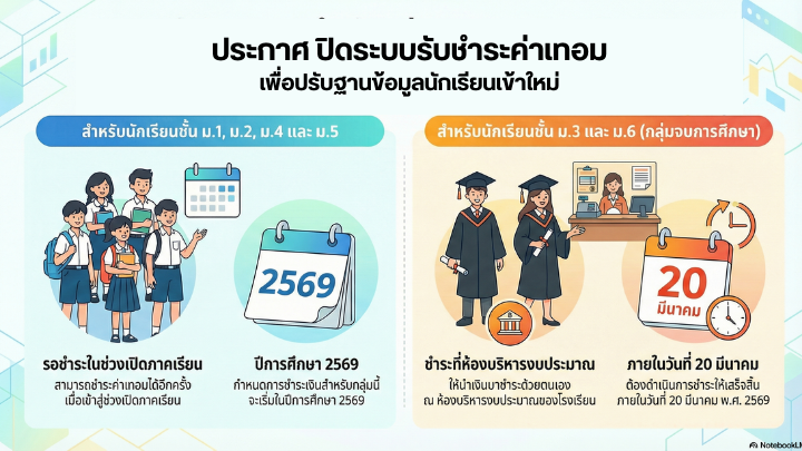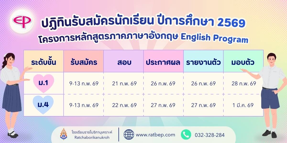 ( 02 มี.ค. 69 ) - ประกาศการรับนักเรียนเข้าศึกษาในระดับชั้นมัธยมศึกษาปีที่ 1 และมัธยมศึกษาปีที่ 4 ประจำปีการศึกษา 2569 ห้องเรียนพิเศษโครงการจัดการเรียนการสอนตามหลักสูตรกระทรวงศึกษาธิการเป็นภาษาอังกฤษ (English Program : EP) (รอบเพิ่มเติม)