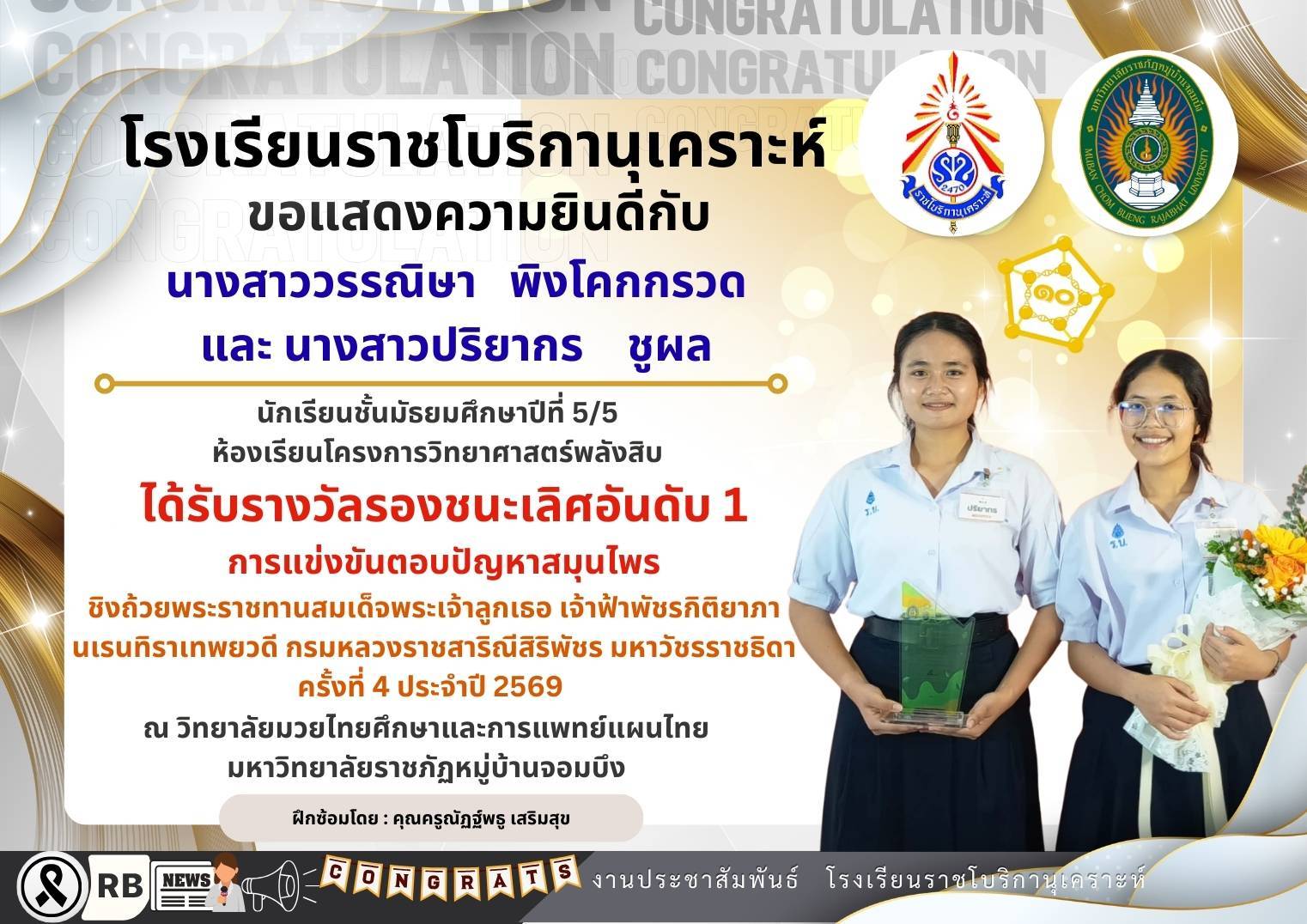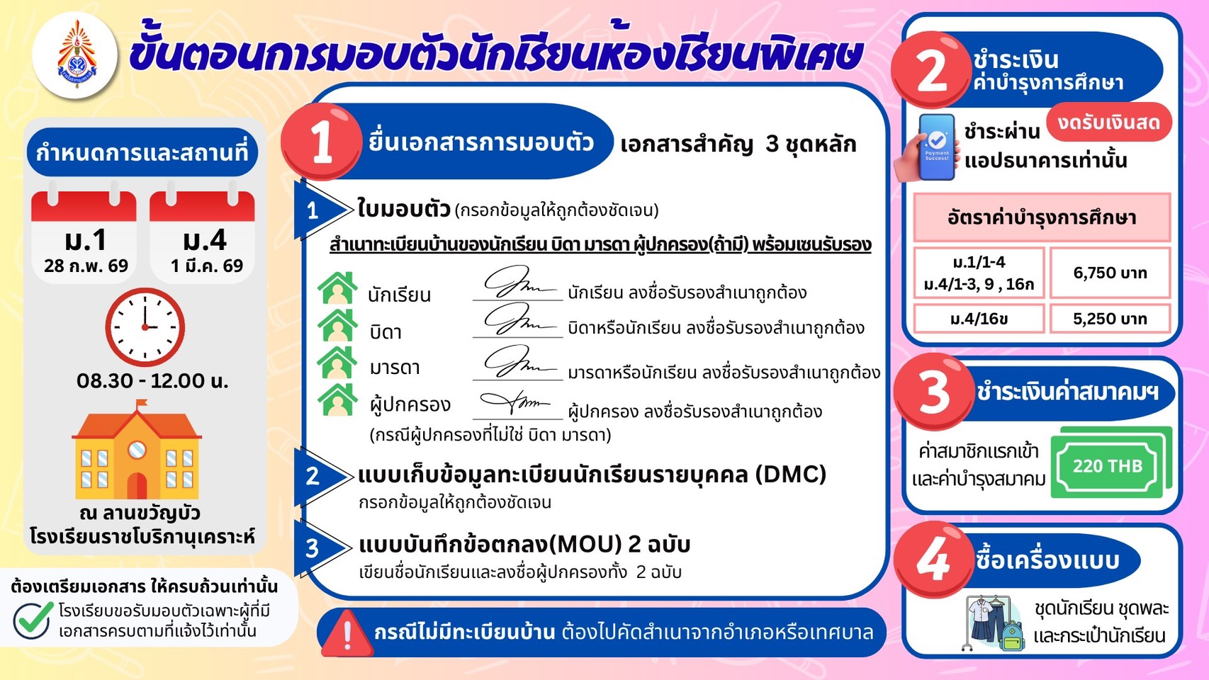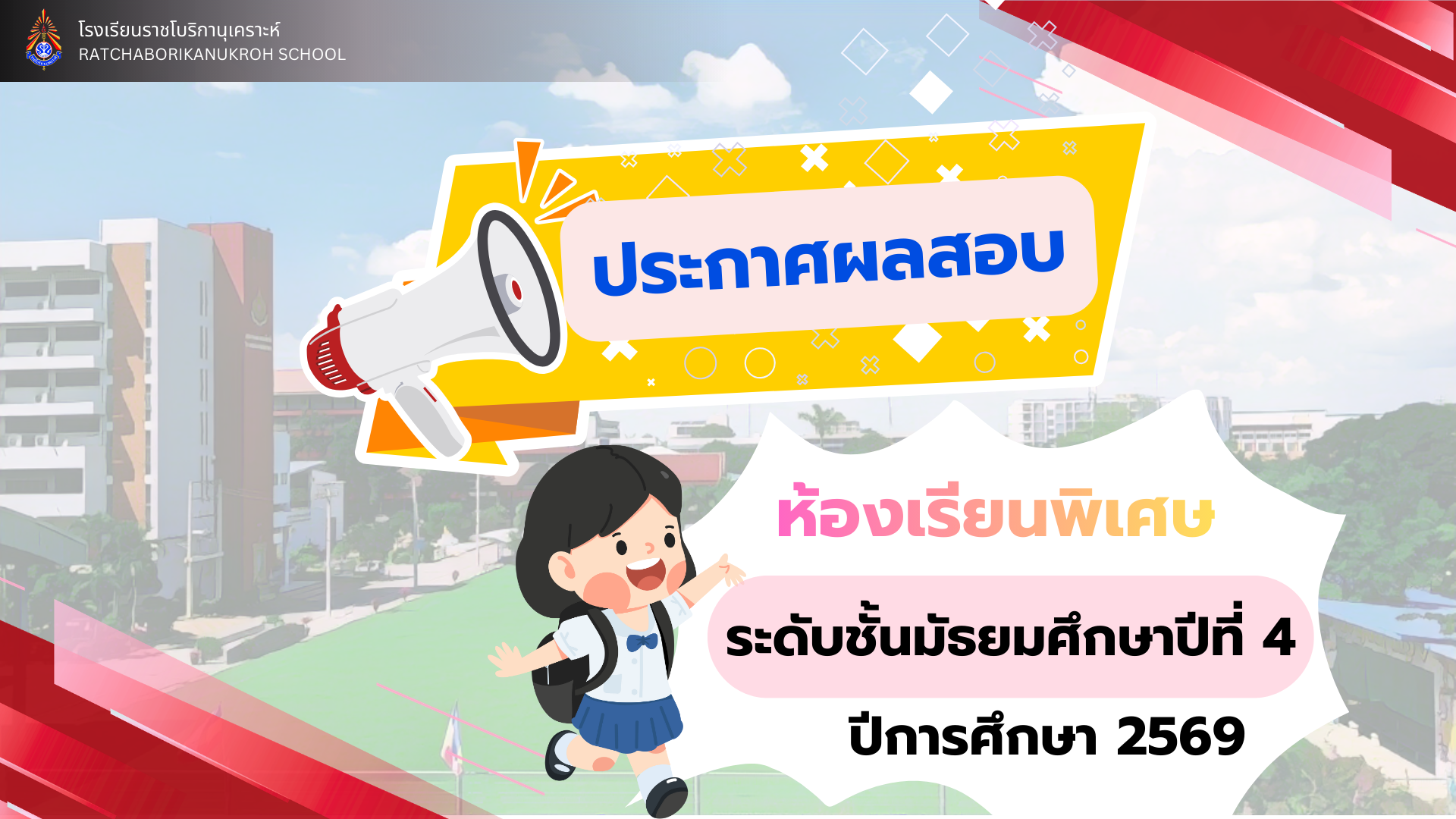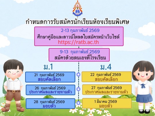( 24 ก.พ. 69 ) - ประกาศผลสอบห้องเรียนพิเศษ ชั้นมัธยมศึกษาปีที่ 4 ปีการศึกษา 2569