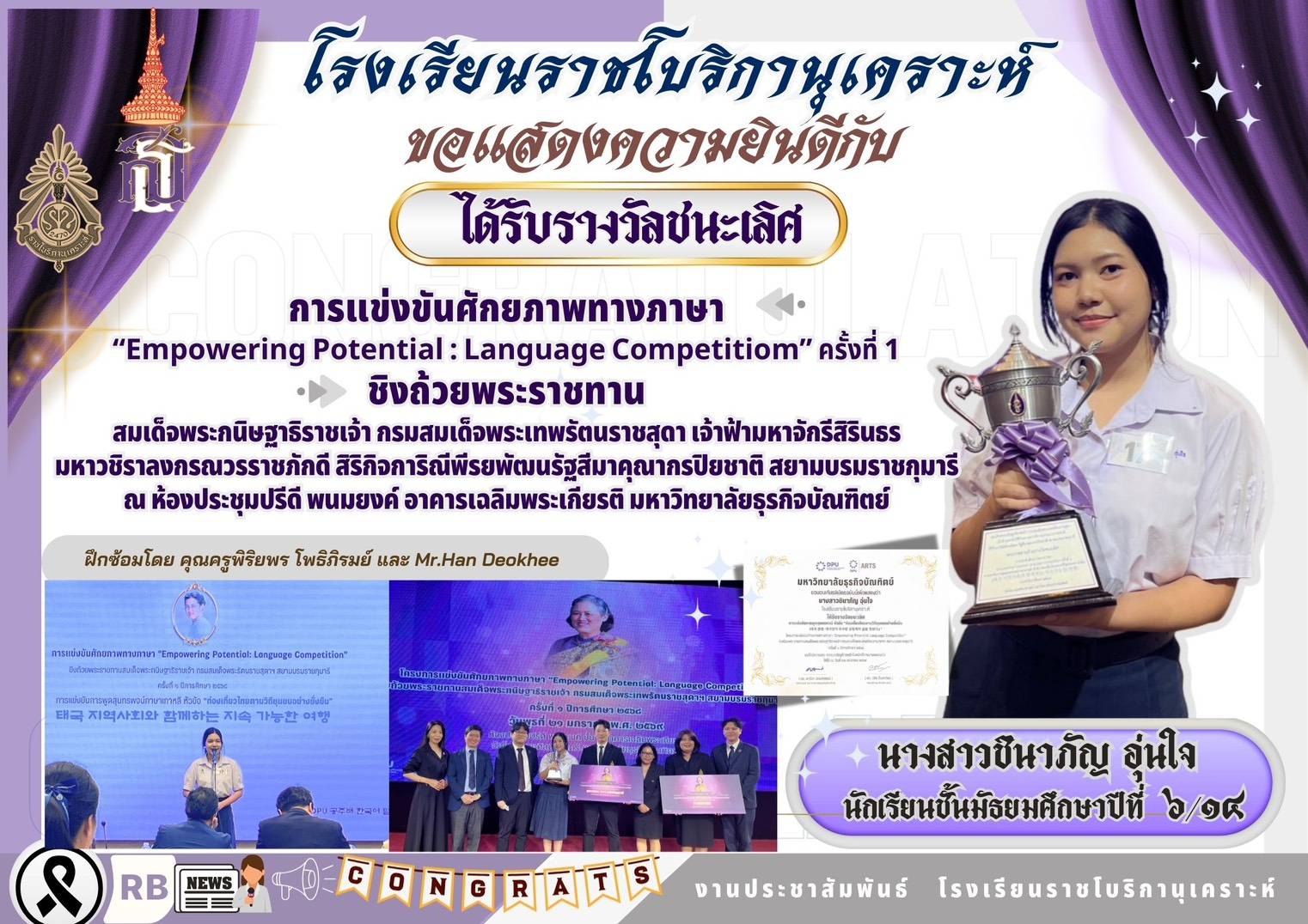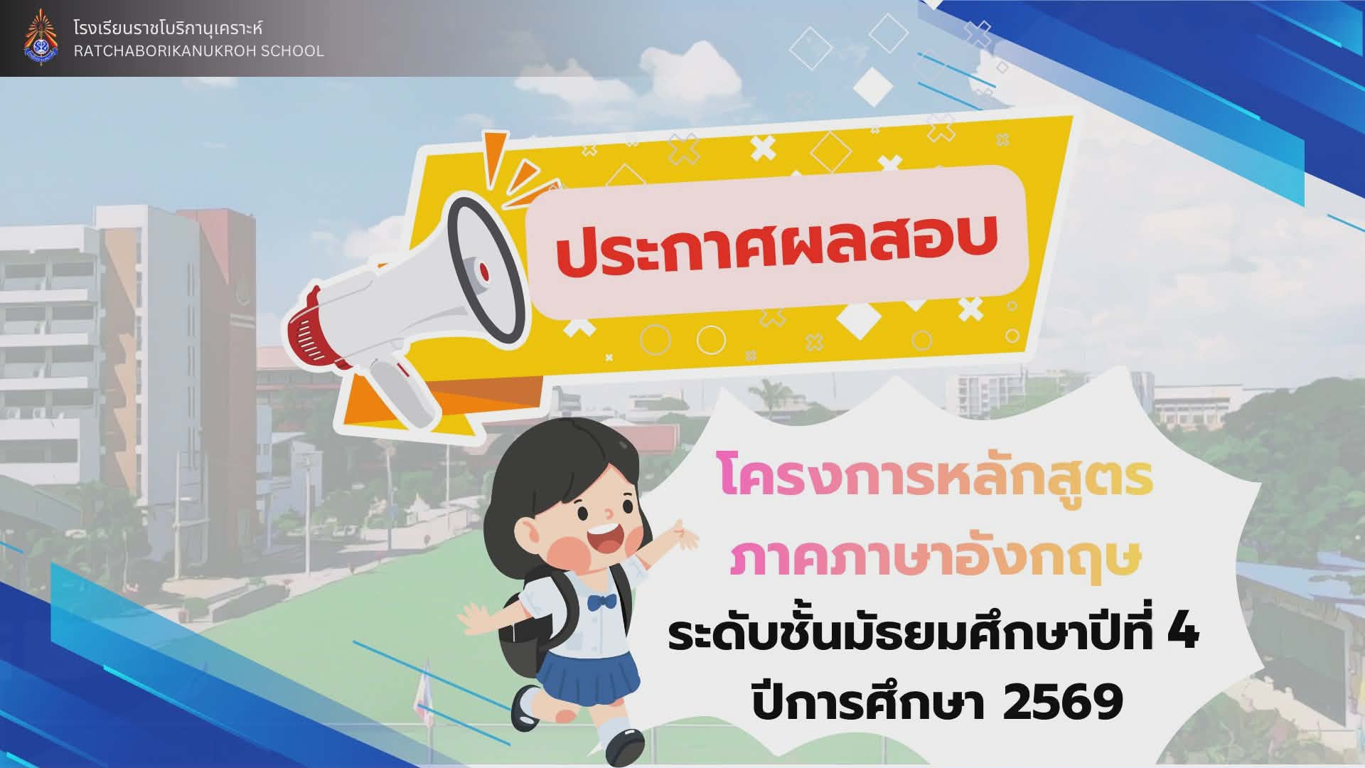 ( 02 มี.ค. 69 ) - ประกาศผลสอบนักเรียนโครงการหลักสูตรภาคภาษาอังกฤษ ชั้นมัธยมศึกษาปีที่ 4 ปีการศึกษา 2569